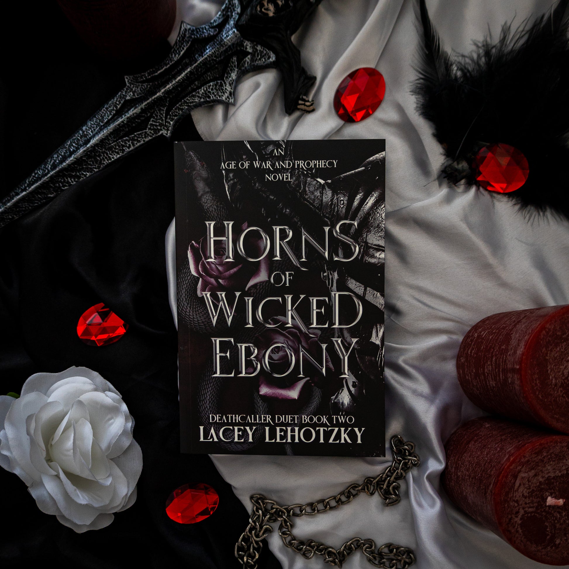 Horns of Wicked Ebony is the second book in the Deathcaller Duet, an enemies to lovers, banter-filled high dark fantasy romance with a vicious, dangerous MMC and a fiery FMC. Perfect for fans of A Choice of Light and Dark, Carissa Broadbent, and LJ Andrews. An Age of War and Prophecy is a series of interconnected duets and standalones centering around the world-altering events of the Great War between the Angels and Demons. While each book or duet has its own romance plot, the war plot requires full series commitment. AAOWAP contains mature, dark themes that some readers might find disturbing. A full TW list is available on the author’s website.